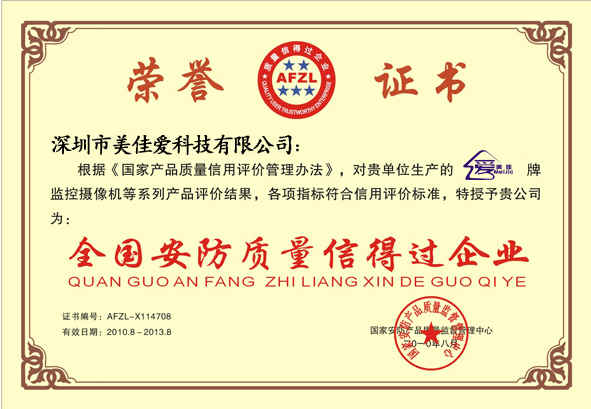 全國安防質(zhì)量信得過企業(yè)證書副本